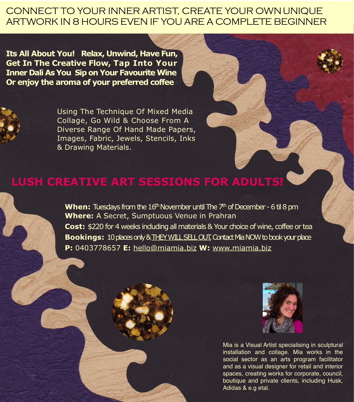 Lush Creative Art Sessions for Adults are an adventure into fun, creativity and inspiration. Mia brings you her 13 years of diverse art creation and teaching experience to offer a unique modern day art session! Mia presents an array of new, found and collected materials to experiment and create unique mixed media art works with.
