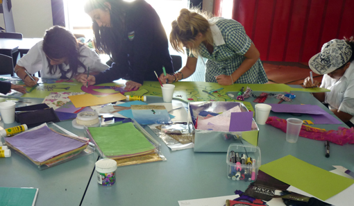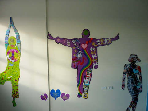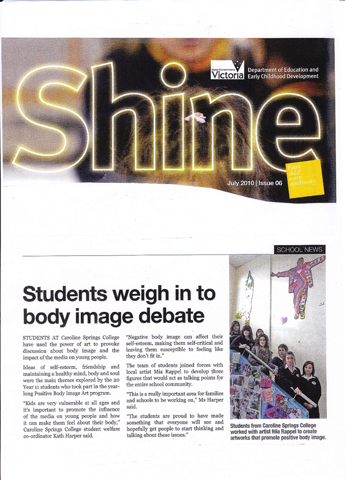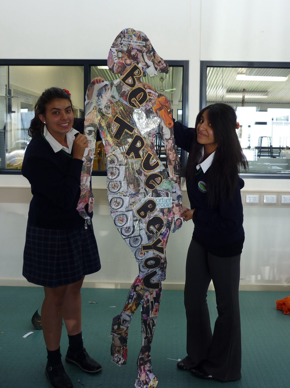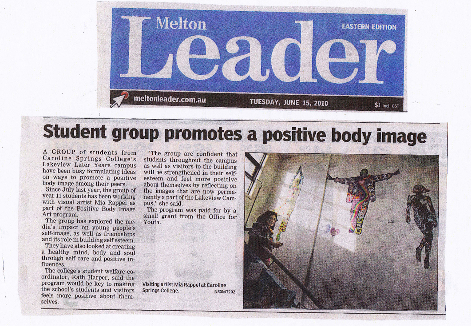 Lakeview Campus June 2010 Mia was approached by Student Welfare Coordinator Kath Harper to facilitate the creation of a permanent artwork responding to Positive Body Image. Mia spent 2 terms with a group of 15 year 11 students devising and creating 3 collaged silhouette figures. Creating the works in small groups, the students explored the factors effecting a positive self and body image, focusing on The Media, Peers and Healthy Mind Body Soul.
